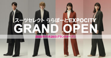 アートディレクター佐藤可士和氏監修のもと、リアルスーツをコンセプトに全国展開しているスーツセレクトは、日本最大級の大型複合施設“ららぽーと EXPOCITY(エキスポシティ)”の3Fに2025年11月28日(金)『スーツセレクトららぽーとEXPOCITY(エキスポシティ)』をオープンいたします。 グランドオープンを記念して、11月28日㈮~12月31日㈬にGRAND OPEN SALEを開催! お近くにお住まいの方は、ぜひこの機会に『スーツセレクトららぽーとEXPOCITY』にお越しください。