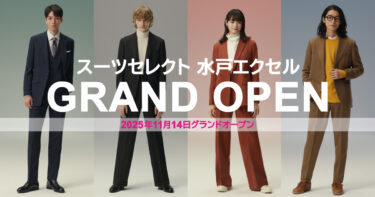 アートディレクター佐藤可士和氏監修のもと、リアルスーツをコンセプトに全国展開しているスーツセレクトは、JR水戸駅直結のショッピングビル「エクセル」の本館5Fに、2025年11月14日(金)『スーツセレクト水戸エクセル』をオープンいたします。 グランドオープンを記念して、11月14日㈮~12月14日㈰にGRAND OPEN SALEを開催! お近くにお住まいの方は、ぜひこの機会に『スーツセレクト水戸エクセル』にお越しください。
