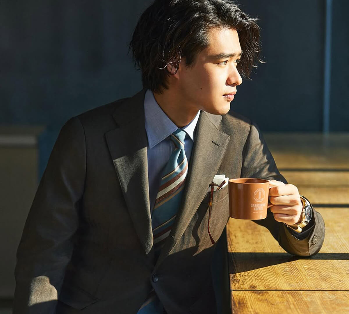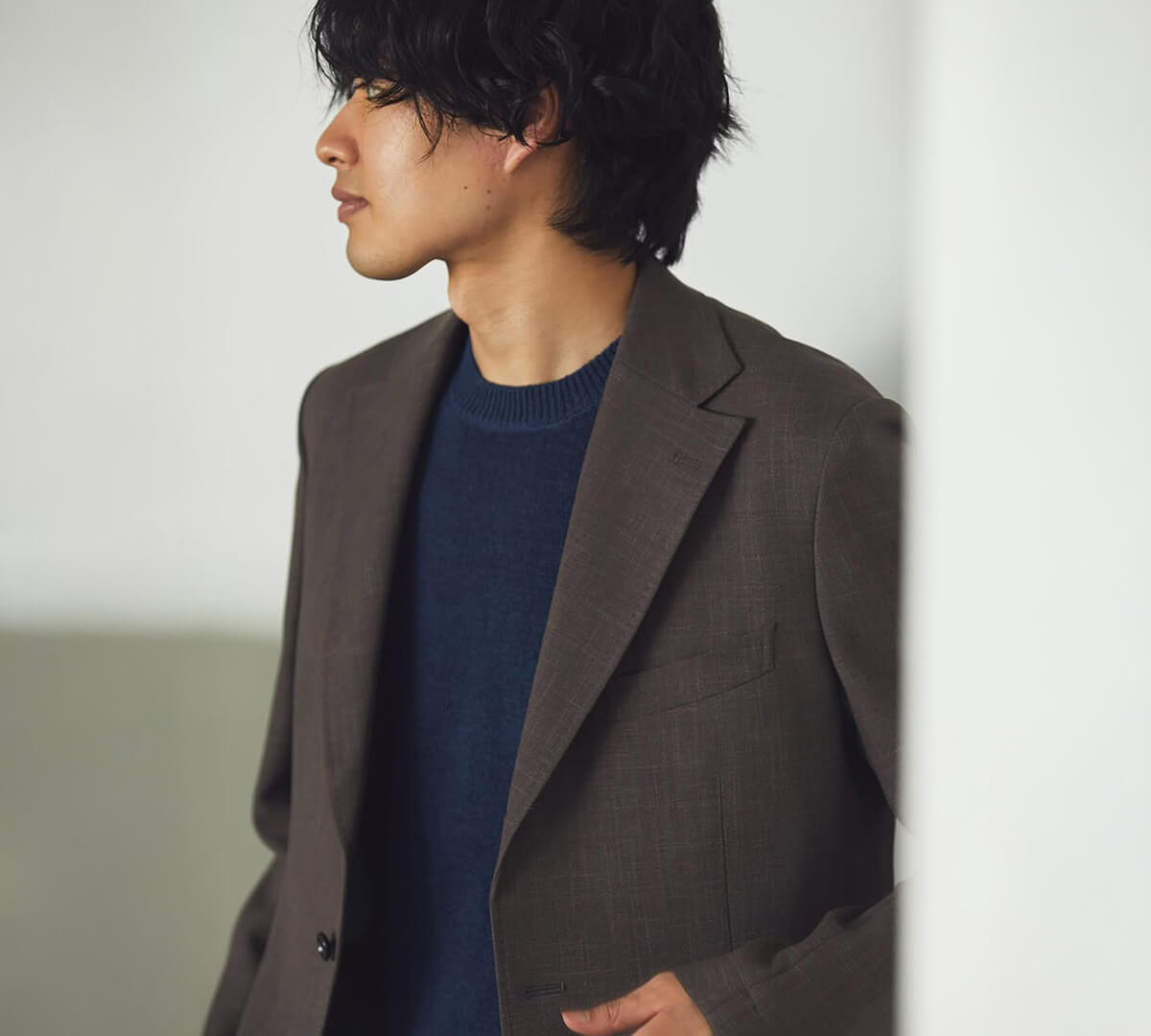 คุณญี่ปุ่น เลือกสวม Jacket รุ่น Seersucker ที่มีเอกลักษณ์ของผ้าเด่นชัดและเป็นสไตล์ที่พบได้ในเฉพาะผ้าชนิดนี้ เป็นเทคนิคของการทอเส้นใยผ้าให้แน่นและทอให้หลวมๆสลับกันไปเกิดเป็นความตึง