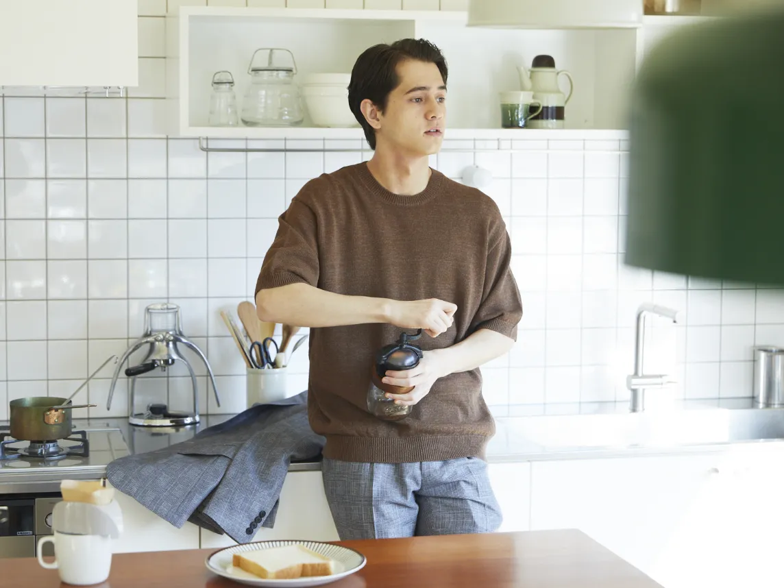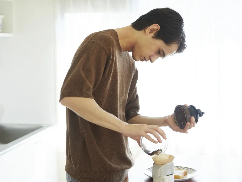 僕の1日は猿田彦珈琲から始まる。きちんと豆から挽いて、香りを立ててハンドドリップ。そんなリラックスした気分になれるのは、やっぱりソフトタッチな4Sスーツだから。