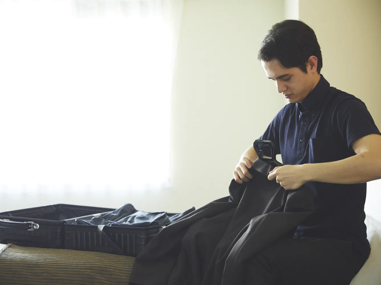 4Sだとシワになりにくいから、出張のときも便利。たためるから、コンパクトなスーツケースでいいし、面倒なアイロンがけがいらないのもタイパがいい。出張に行くときは絶対4S。