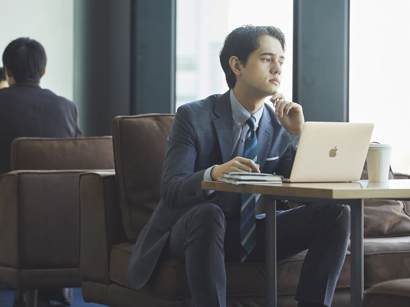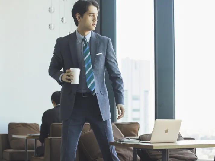商談前にカフェで資料づくり。今日は好印象のレジメンタルタイを合わせてみた。腰深く座っても、立ってもシワにならないから、4Sってすごい。だから、気持ちもリラックスできる。