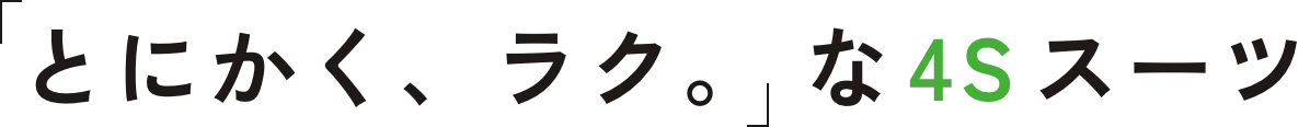 スーツをまだ着慣れていない初めてのスーツこそSUIT SELECTの「4Sスーツ」。ウールライクにきちんと見えするスーツなのに、ノンストレスで着られてお手入れもラク。 4Sスーツは「とにかく、ラク」なスーツです。