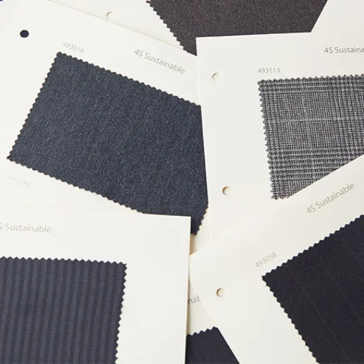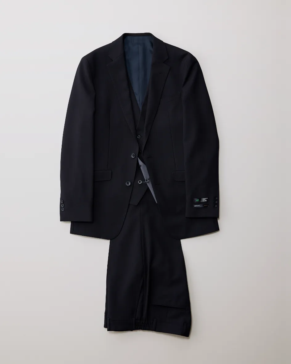環境に優しいリサイクル素材を使用。ポリエステルなのに、ここまできちんとウール見えするスーツってすごい。