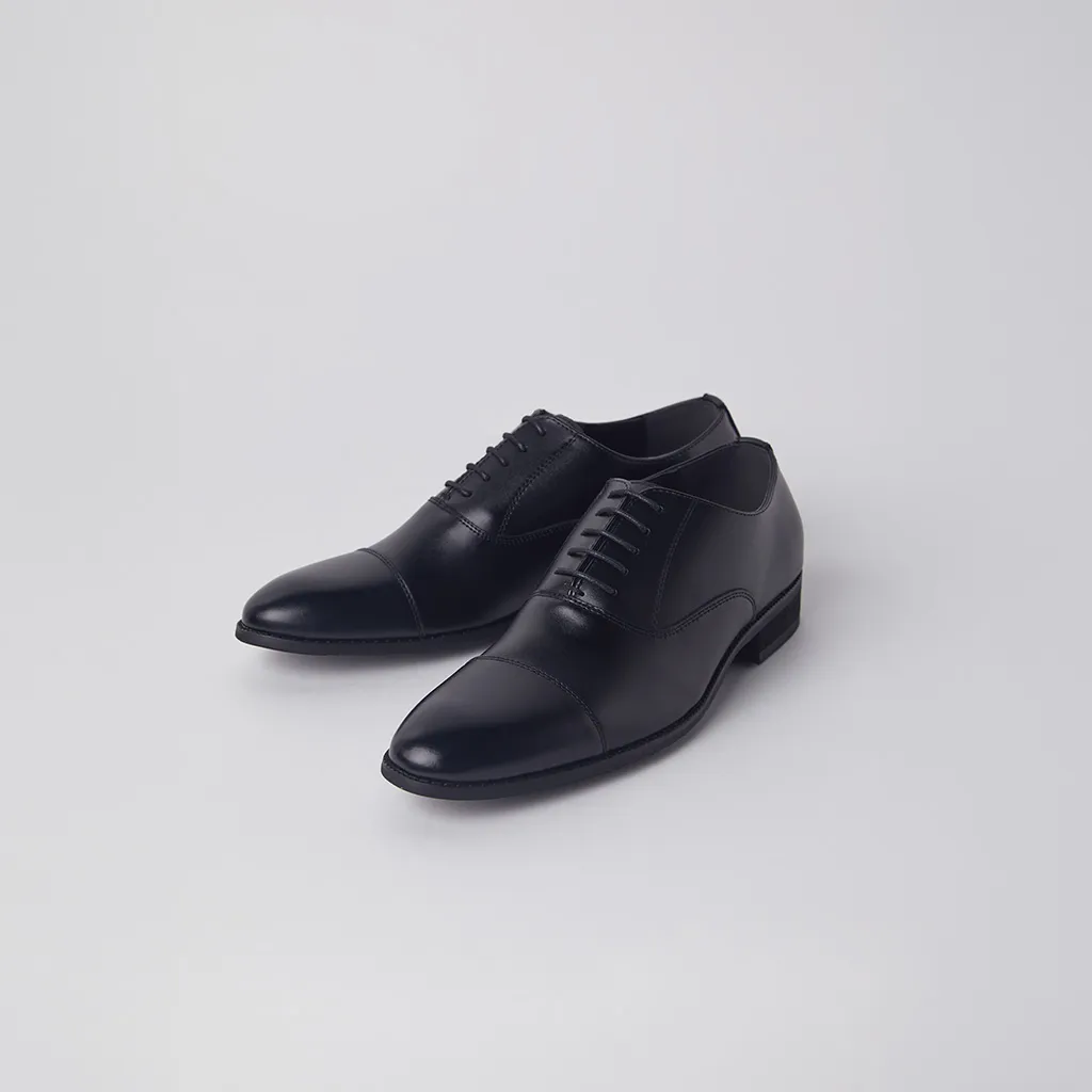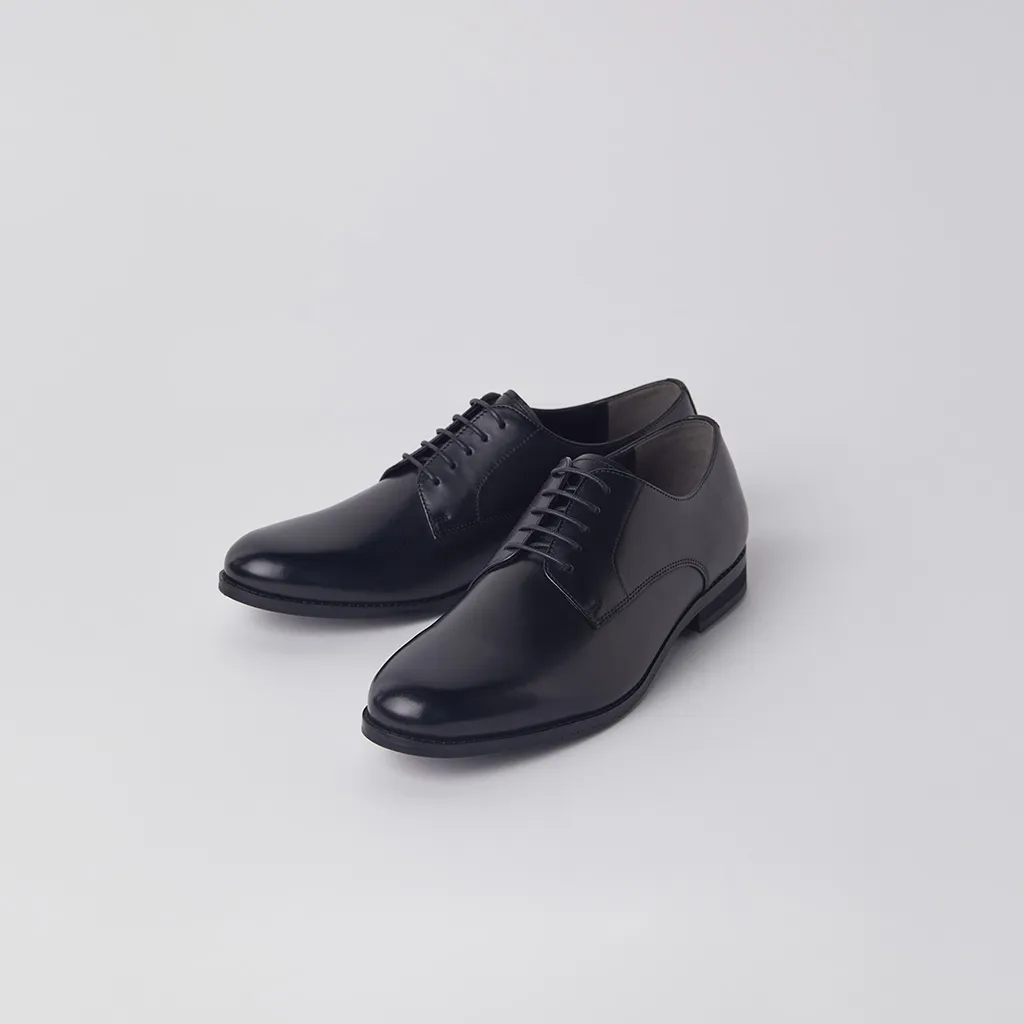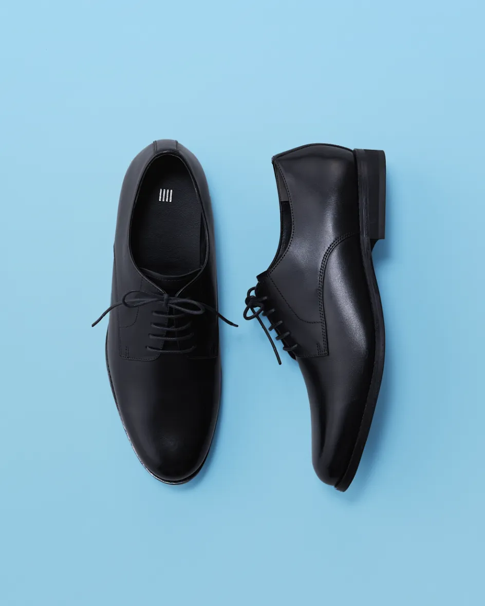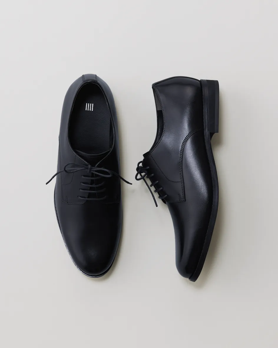 シンプルな黒のプレーントゥ。耐久性や耐摩耗性、軽量感に優れているので、長時間歩くビジネスマンに最適。