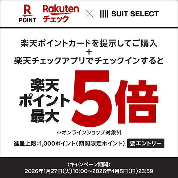 キャンペーン期間中にエントリーして、スーツセレクトの対象店舗で楽天ポイントカード(アプリを含む)を提示して100円(税抜)以上お買い物すると、