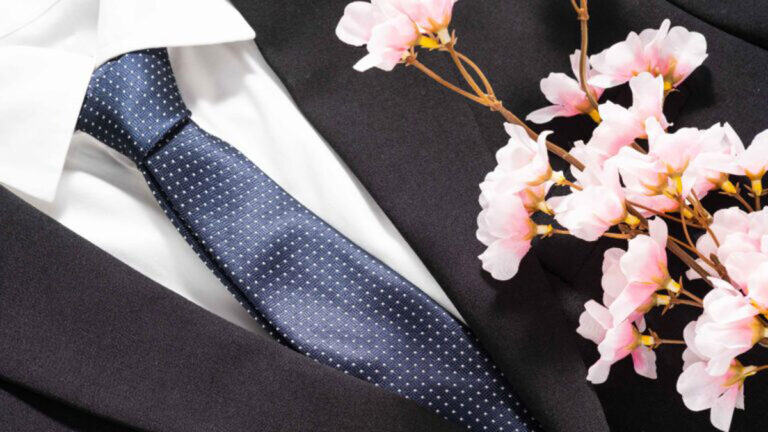 ネイビースーツは落ち着いた印象の色なので、小物でさりげなくお祝いの雰囲気をプラスするのがおすすめです。女性であれば淡い色のコサージュを添えることで、式典らしい華やかさが生まれます。男性の場合は無地や控えめな柄のネクタイで、明るめの色を取り入れるとバランスよくまとまります。