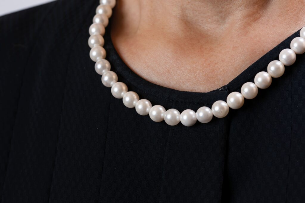 小ぶりで首元に沿ったパールの一連ネックレスや、一粒パールのイヤリングを合わせるとフォーマルな印象になります。二連のネックレスは不幸が重なる、ロングネックレスも不幸が長引くなどと言われ、避けた方がよいと言われています。