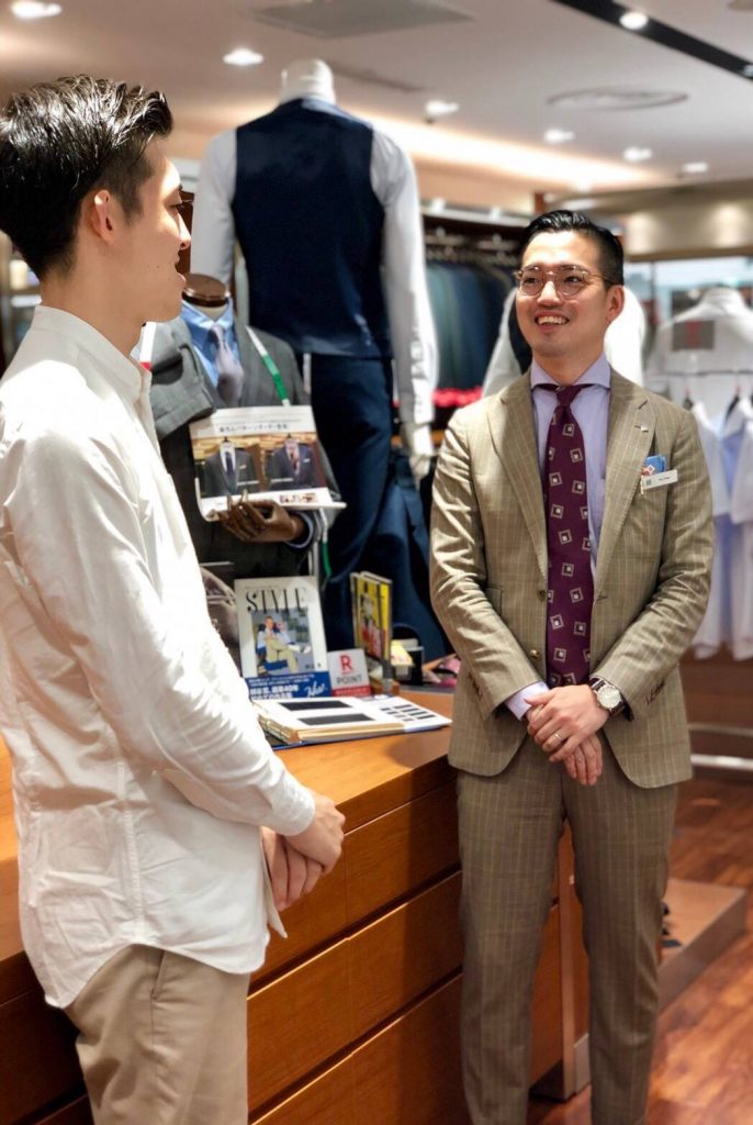 それでは実際にパターンオーダーを仕立てる流れをみていきましょう。スーツセレクトのマネージャー曽我さんと、新人スタッフ谷口さんに登場していただきます。一緒にオーダーを体験している感覚を味わって頂ければと思います。