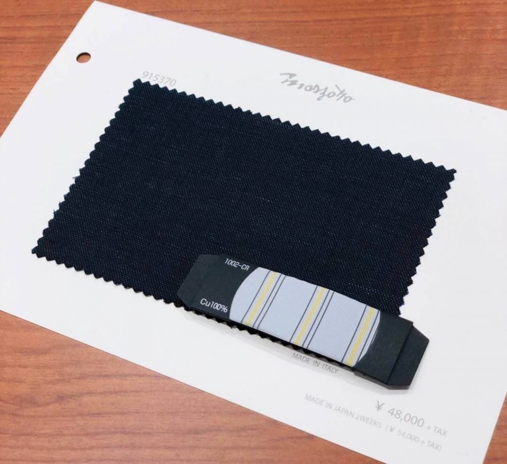 曽我:「こちらはイタリアの老舗MARZOTTO社の物で、打ち込みが強く、滑らかな手触りと風合いが特徴のリネン混の生地です。こちらのようなミッドナイトネイビーでしたら、新郎・新婦を引き立てる色であり、黒と同等のフォーマル度があるため、ゲストとして出席する結婚式でも問題なく着用できます。更にリネン混なので夏場でも快適にお召し頂けますよ」
