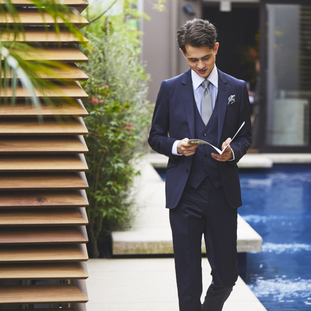 日本ではブラックフォーマルの印象が強いかもしれませんが、実はネイビーも結婚式での万能カラー。特にミッドナイトブルーのようなダークカラーのスーツであれば、親族や立場のある方も、挙式からの参列、主賓での参列、上司の結婚式への参列など、式場も問わず様々なシーンで着用できます。