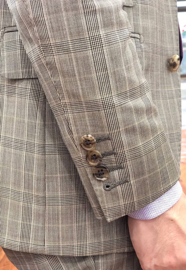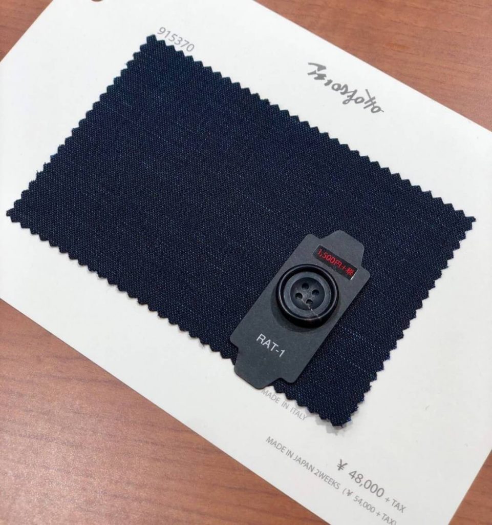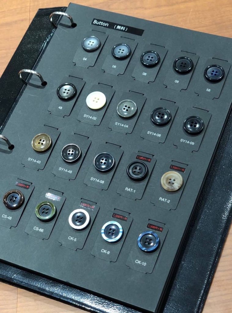 曽我:「スーツの『顔』とも呼ばれ、印象を大きく左右するのがこの『ボタン』です。無料オプションの釦は13種類、+2,200円の有料オプションの釦を7種類ご用意しております。今回はイタリア生地をお選びいただきましたので、その生地に合うこちらの天然素材の本水牛ボタンがおすすめです。いかがでしょうか?」