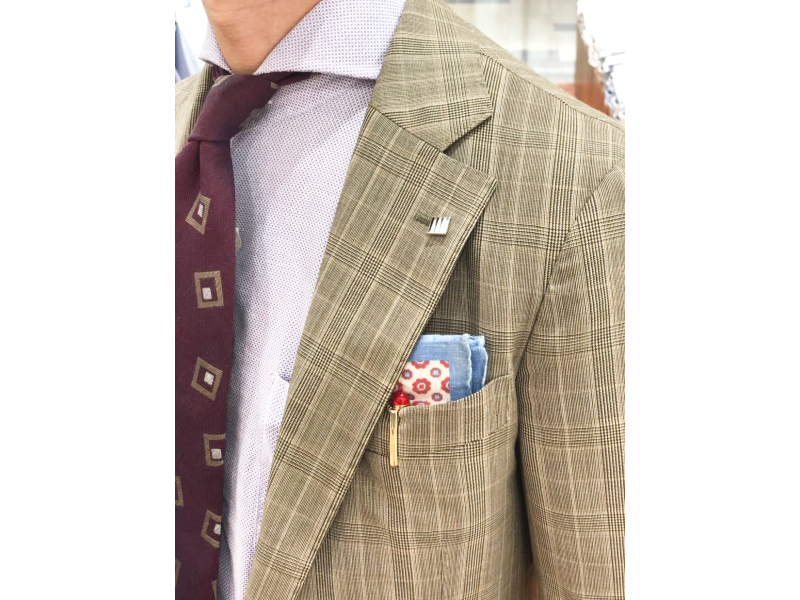 曽我:「ありがとうございます。色合いも風合いも、お選び頂いたスーツにバッチリ合いますね。素材の良さがお互いを引き立てあって、生地との調和が取れています」