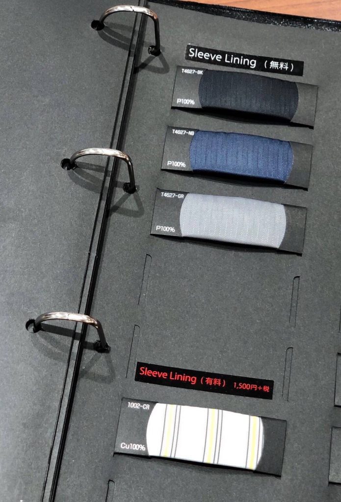 曽我:「胴裏は、あまり表からは見えない部分で、フロントボタンを外した時や脱いだ時にチラっと見えるのが粋なオプションです。無料オプションで10種類、有料オプションで21種類からお選び頂けます。」