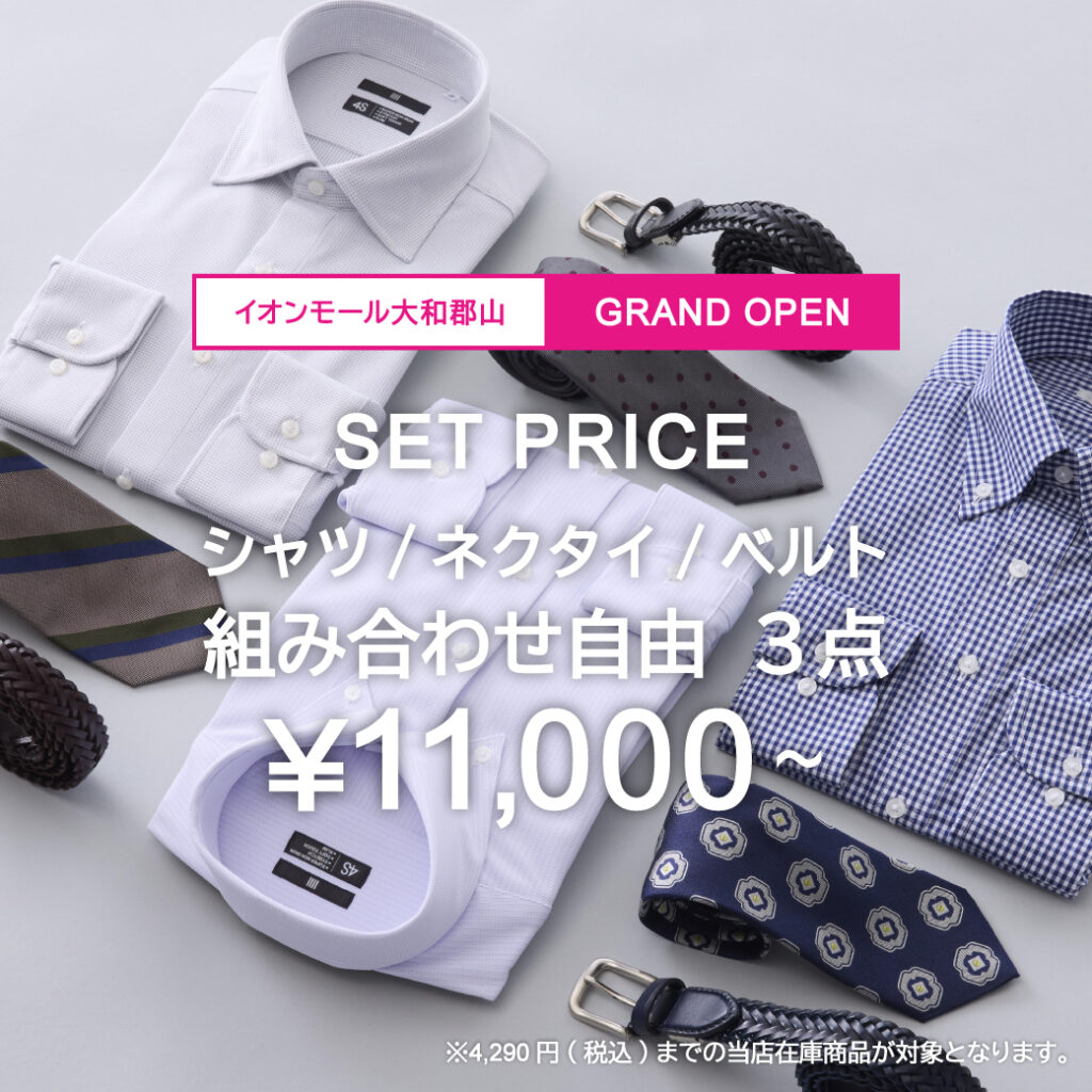 『GRAND OPEN SALE』の期間中、限定で、¥4,290までのワイシャツ/タイ/ベルト組み合わせ自由3点で¥11,000~‼