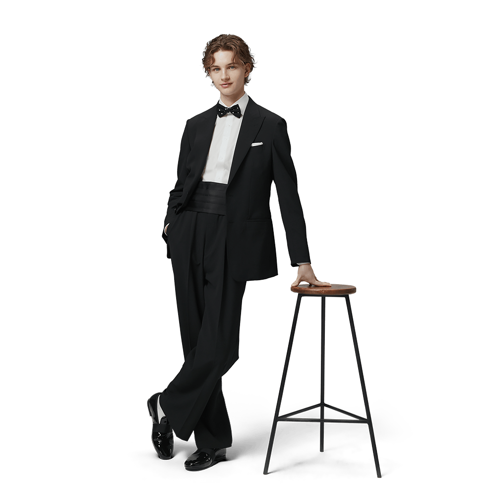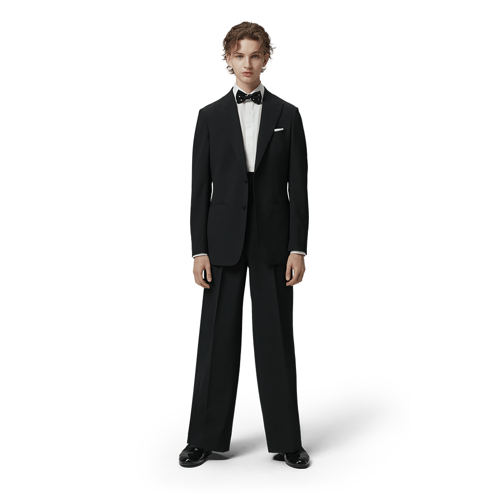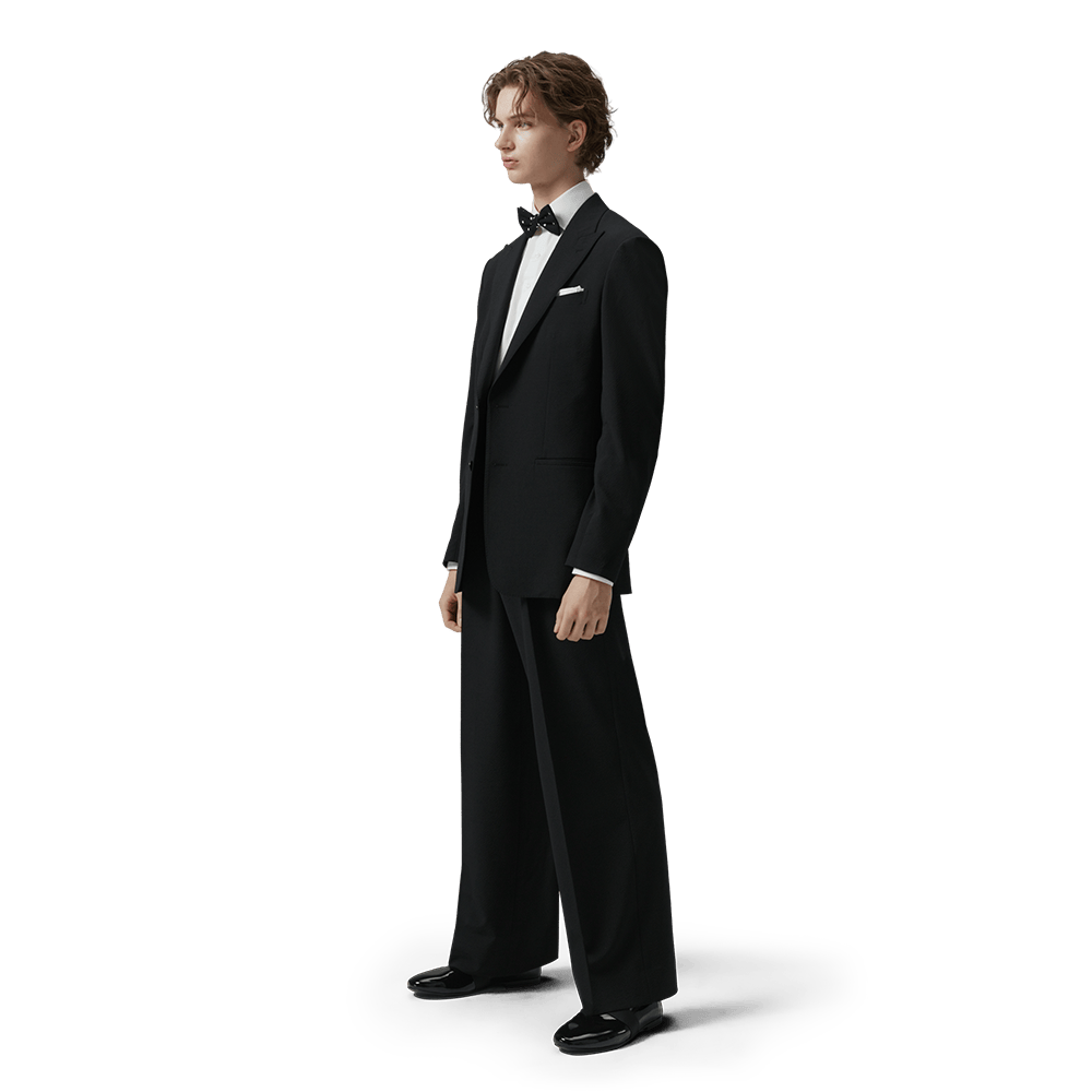 ウィングカラーのシャツにボウタイを合わせることで、格式高いパーティーシーンにも対応する品格を演出しています。ワイドパンツのボリュームが、従来のタイトな礼服にはない「余裕」と「モード感」を与えます。