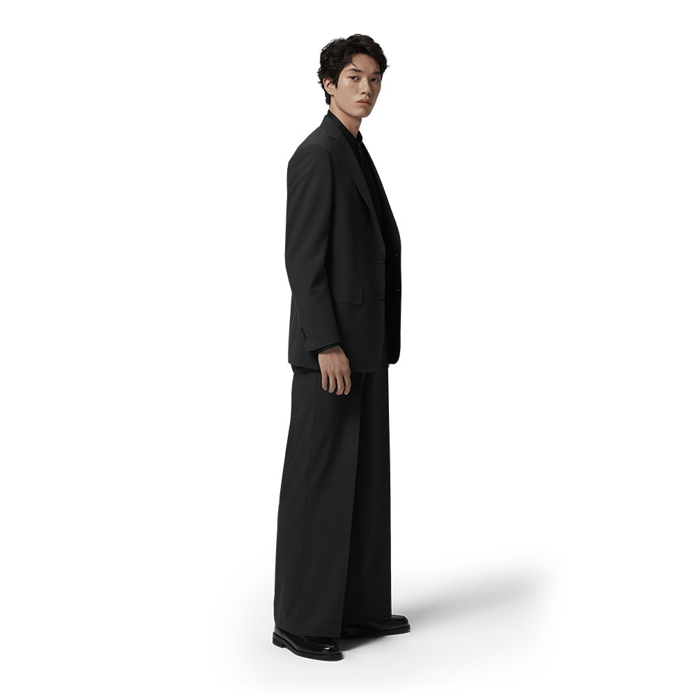 目付けわずか160gという超軽量素材「NZ AIR」を採用。特殊紡績糸「サイロフィル」によるなめらかな肌触りと、シワになりにくい機能性が、ビジネスシーンに「涼」と「ゆとり」をもたらします。インナーには濃色のバンドカラーシャツをノータイで。全身をダークトーンで統一することで、ワイドパンツのボリュームが縦のラインを際立たせ、よりスマートで洗練された佇まいに仕上がります。